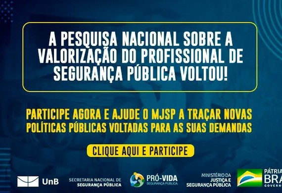 Como parte do Programa Nacional de Qualidade de Vida para Profissionais de Segurança Pública (Pró-Vida), o Ministério da Justiça e Segurança Pública (MJSP) prorrogou até o dia 10 de fevereiro de 2022 a maior pesquisa nacional sobre a valorização de