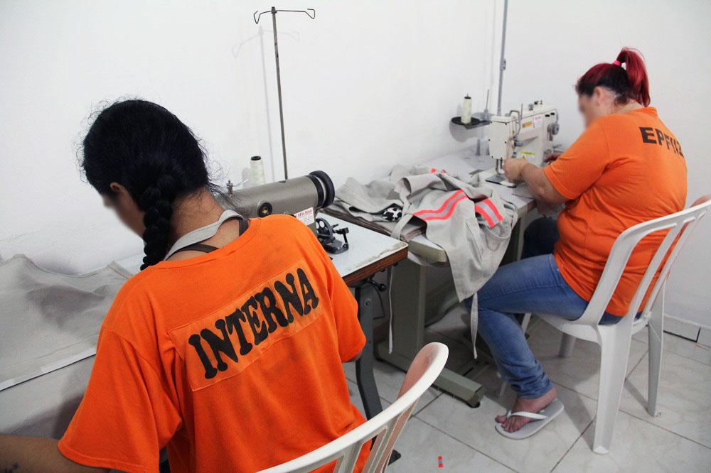 Nas mãos de cinco mulheres privadas de liberdade, calças e camisetas são recicladas e viram aventais, bolsas e lixeiras de veículos, dentro da oficina de costura do EPFIIZ. Em média, são confeccionadas 15 peças diariamente.