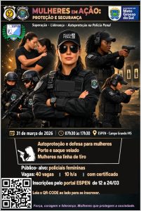 A ESPEN/MS (Escola Penitenciária de Mato Grosso do Sul) promoverá, no dia 31 de março, o evento “Mulheres em Ação: Proteção e Segurança”, voltado exclusivamente às policiais penais femininas do estado. A iniciativa busca valorizar, capacitar e fortalecer a atuação das servidoras, por meio de atividades voltadas à autoproteção e ao aprimoramento técnico no exercício da função.