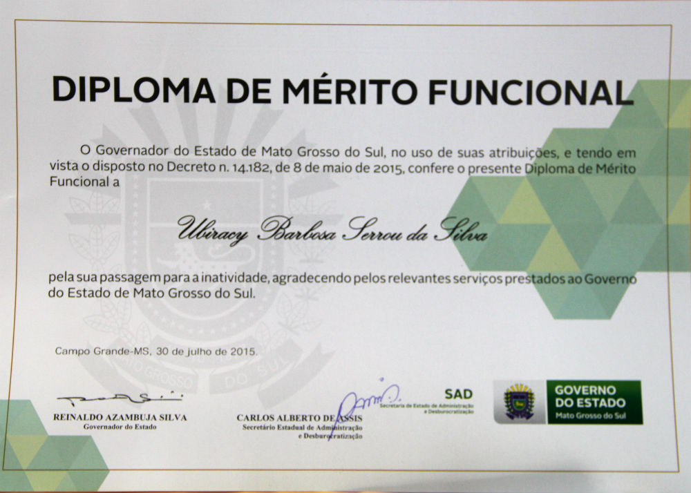 Para o Secretário de Administração e Desburocratização Carlos Alberto de Assis, essa é uma forma simbólica de agradecer por tantos anos de dedicação e prestação de serviços à população do Estado. “O diploma é o reconhecimento e agradecimento do Governo do Mato Grosso do Sul a cada uma dessas pessoas que dedicou anos de sua vida profissional em prol do serviço público”, pontuou.