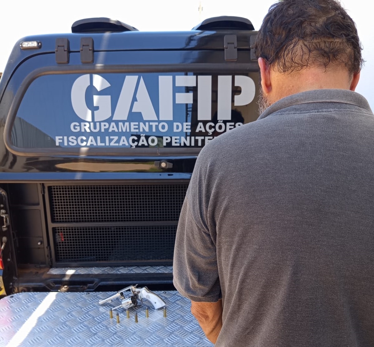 Durante a abordagem, os policiais penais realizaram procedimento de revista pessoal. Na inspeção, foi encontrado um revólver calibre .38 com numeração raspada, acompanhado de seis munições intactas.