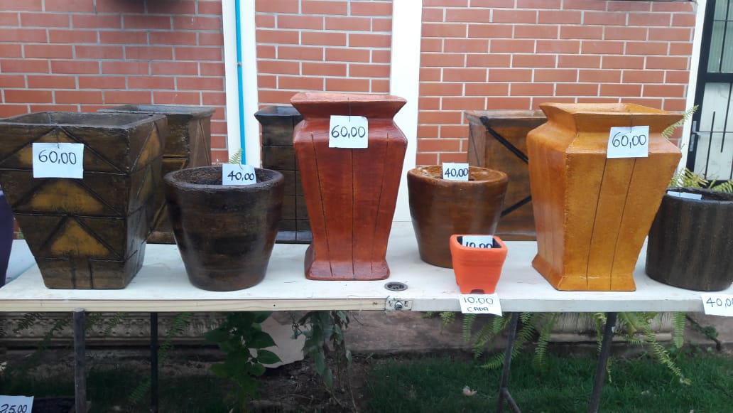Para a confecção dos vasos, os internos utilizam materiais como cimento, cal, isopor ralado, impermeabilizantes, tintas acrílicas, esmalte e verniz com filtro solar. O isopor deixa os vasos com peso menor e diminui o calor no interior da peça.