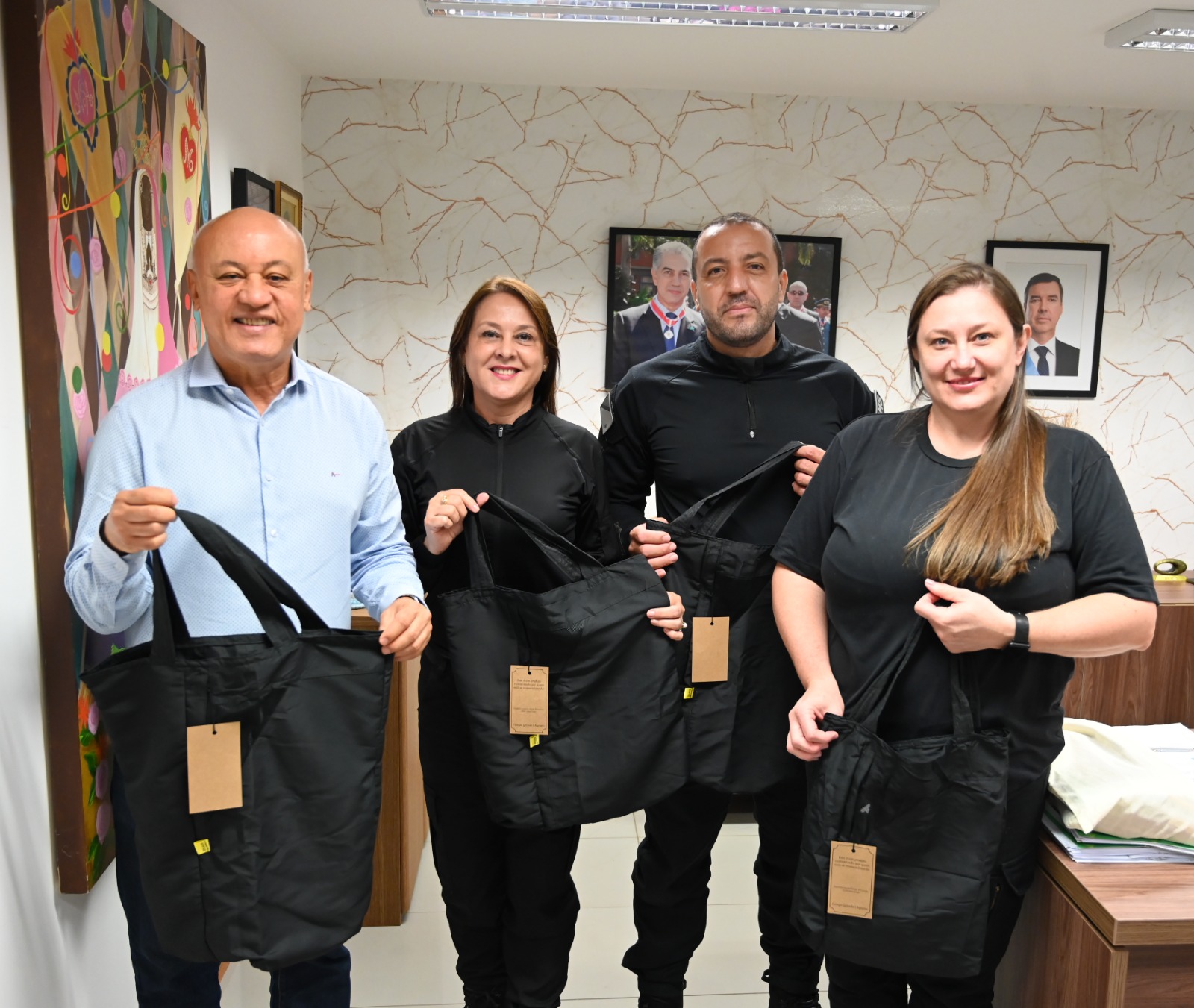 As sacolas, que ainda serão serigrafadas,  foram entregues ao diretor-presidente da Agems, Carlos Alberto Assis, pela diretora do EPFIIZ, Mari Jane Boleti Carrilho, pela responsável pelo setor de artesanato do presídio, Michele Fruhalf, e pelo diretor de Operações da Agepen, Flávio Rodrigues.
